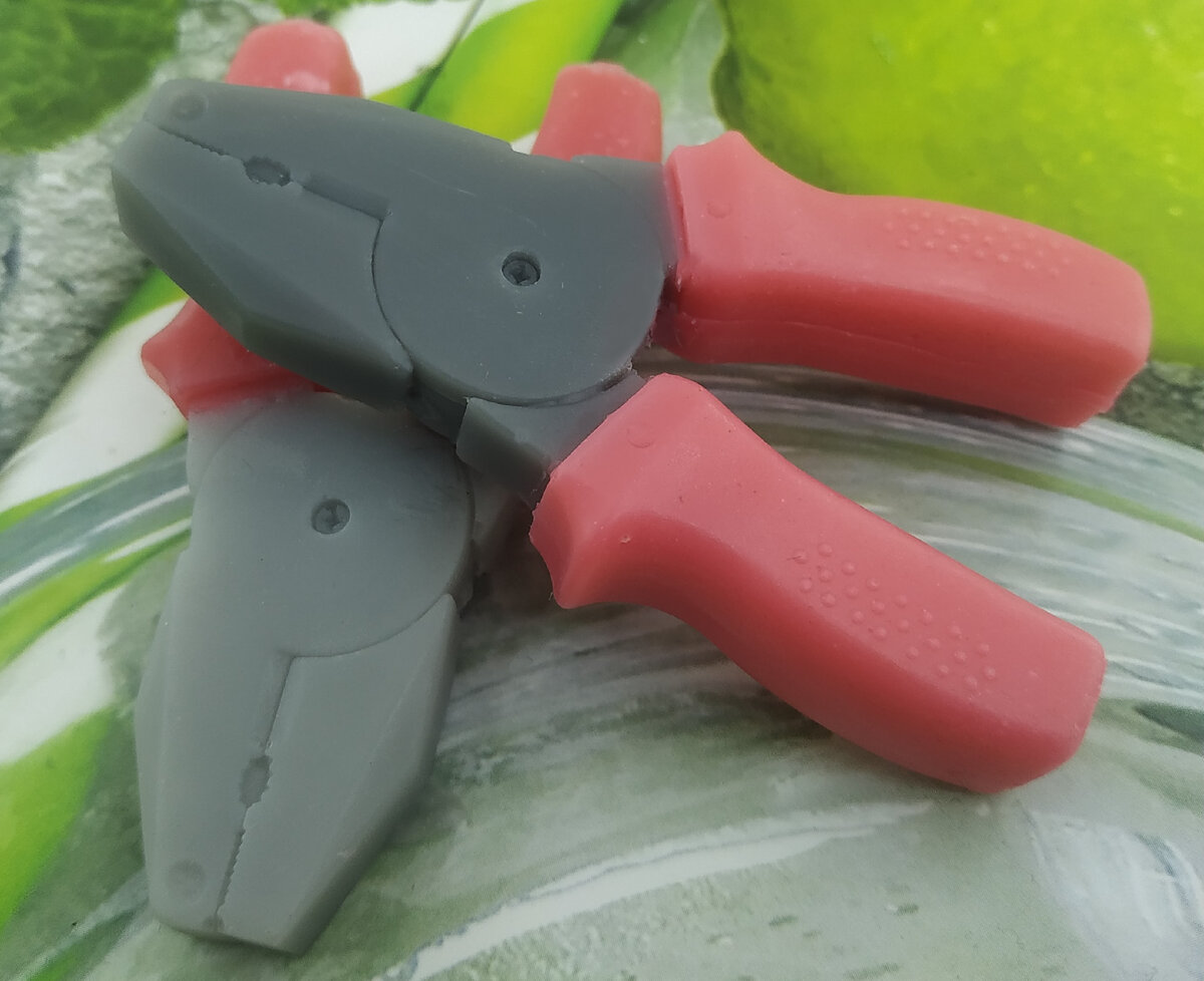 Приветствую! В данной статье я опишу достаточно сложную заливку силиконовой формы для мыла "Плоскогубцы 3D". Основная сложность этого мыла - правильно сделать ручки, т.к. они расположены под небольшим углом к металлической части изделия и обычная заливка даст не очень хороший результат. На заглавном фото можно заметить - рукоятки отлиты и выглядят примерно так же как и на настоящем инструменте. Добиться этого результата можно только подрезанием мыла после первой заливки. Метод заливки Форма достаточно глубокая и визуально сложно определить сколько мыла нужно лить на "металлическую" часть. Так что заливаем с небольшим запасом, этот же запас пригодится нам во время подрезания. После застывания основы нам потребуется наполовину вывернуть форму. Силикон достаточно эластичный и не нужно бояться что он порвется - проверено неоднократными заливками. Важно! Если у вас не получается вывернуть форму как на фотографии, то сделайте боковой разрез на силиконовой форме. Это так же даст требуемый р