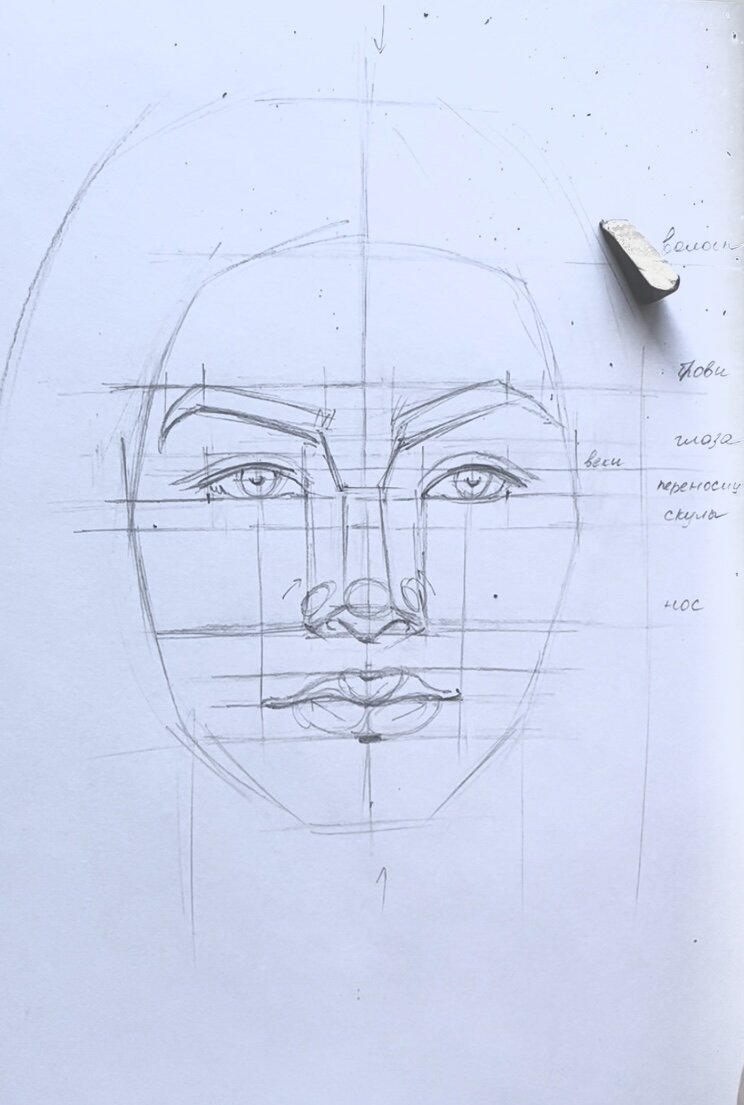 1 часть- 2 часть- Продолжаем: 14 Намечаем брови. Сравниваем их с шириной и расположением глаз и носа 15 намечаем фронтальную часть носа (спинку). Переносица -сама узкая часть 16 Определяем уровень кончика носа. Он немного выше основания носа 17 сравниваем ширину губ с расположением зрачков. Они находятся примерно на одной линии 18 намечаем силуэт губ. Самая тёмная линия-между губами. Остальные линии должны быть не такими яркими 19 намечаем вырезы ноздрей. Рисуем только верхнюю их часть 20 Лёгкими овалами намечаем кончик носа ( самый большой) и крылья носа ( поменьше, немного наклонены в сторону кончика) 21 затемняем нижнюю поверхность носа ПОЗДРАВЛЯЮ! ВЫ МОЛОДЕЦ! 🥳 ТЕПЕРЬ ВЫ ЗНАЕТЕ БАЗОВЫЕ ПРИНЦИПЫ ПОСТРОЕНИЯ ЛИЦА Теперь важно потренироваться рисовать их самостоятельно Подписывайтесь, ставьте 🤍 Дальше будет ещё полезнее 👍 #урокирисования #портреткарандашом #пропорциичеловека