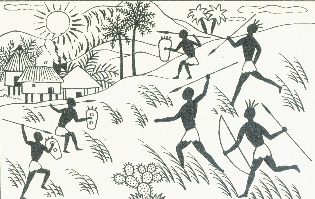 "Тяжелое детство, деревянные игрушки" - эта фраза точно про тех несчастных людей, которых называют аборигены. Почему же несчастных, скажите Вы и будете совершенно правы. Несмотря на то, что у аборигенов нет телевизоров, смартфонов и Интернета, их жизнь не становится менее яркой. Аборигены привыкли к своему образу жизни, их все устраивает, и они навряд ли хотели бы жить в нашем мире. Только представьте, Вы радуетесь подаренному, новенькому смартфону, а аборигены радуются новому копью, новой чашке из глиняной посуды или найденной связке желтых бананов. Для того, чтобы выжить в среде своего обитания, аборигены должны добывать себе и членам своей семьи пищу. Каким же образом, ведь особо животноводство у них не развито? Правильно, охота и рыбалка - это наиболее актуальный способ добычи еды и формирования запасов этих людей. Посмотрите на сегодняшнюю картинку. На ней несколько, а точнее 6 аборигенов бегут за зверем, охотятся. Копья и лук их основное и незаменимое оружие. А теперь задание гол