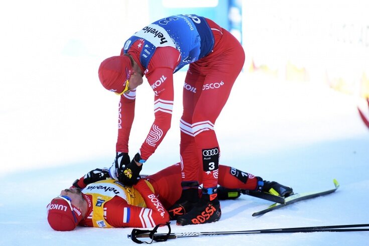 Большунов финишировал в гонке с разбитым лицом после столкновения с Устюговым (видео)
