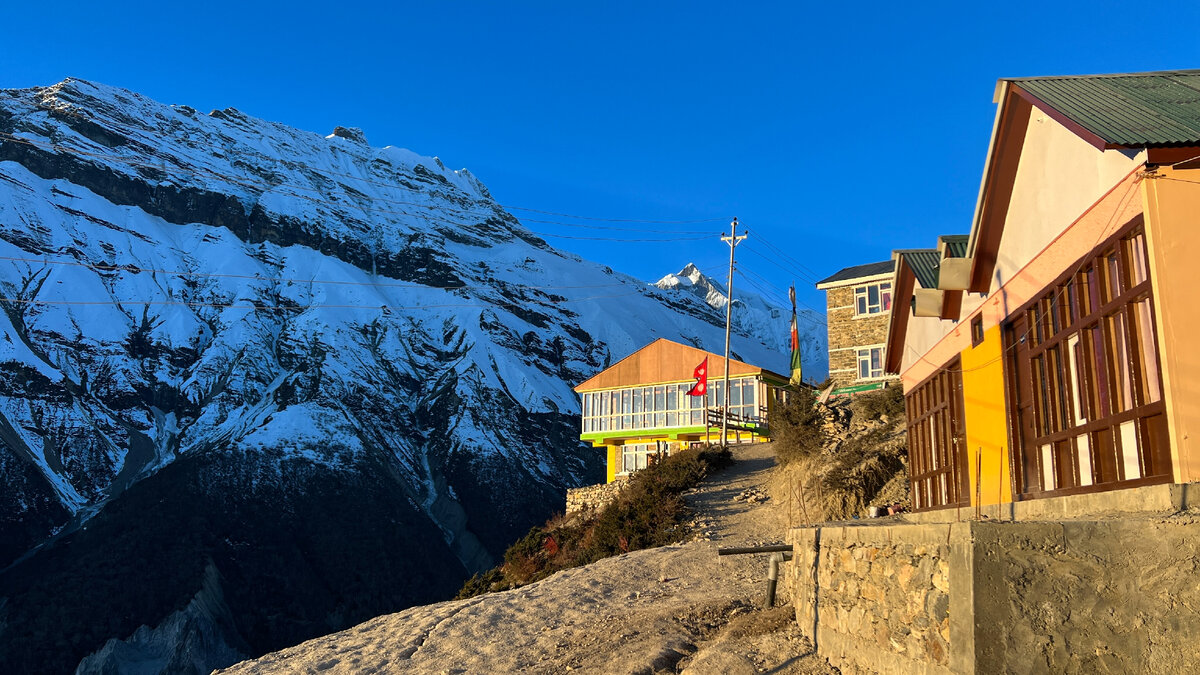 Наконец-то наступило утро. Утро в китайской деревне. Солнце еще не вышло, но будильник уже прозвенел. Хотя я уже не спал. Спалось плохо. Сначала сложно было уснуть, потом постоянно просыпался. Все-таки на высоте организм не хотел засыпать и включал защитную реакцию. Суммарно часа 4 поспал. Холодина неимоверный. В номере утром было минус 4. Рожа, опухшая вся, глаза узкие, а умыться особо не чем. Вода в кране и в туалете замерзла. Благо, чтоб почистить зубы была бутылка с водой, которая лежала в вещах, и она чудом осталась «жива». Солнце осветило горизонт. Красиво, восход прямо за горой Манаслу, которая возвышалась в конце долины. Опухшие, охрипшие, говорящие в нос мы стали одевать на себя все, что было и выходить на завтрак. В столовой тоже было холодно и даже имбирно-лимонный чай с медом не спасал. Колено болело, поэтому две таблетки нурофена были вынужденными. И еще традиционно ингаверин, леденцы от кашля и витаминки. Снова утром сморкался с кровью. Капилляры не выдерживали холода и к