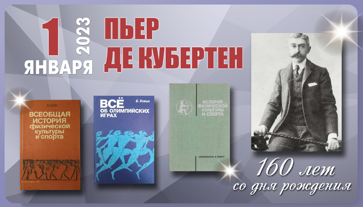 Здравствуйте, уважаемые читатели! От всей души поздравляем вас с наступившим новым годом! Желаем вам радости, мира, крепкого здоровья! Надеемся, что наши «книгодарные» встречи будут продолжаться и в наступившем 2023 году. А сегодня, в этот первый январский день, мы хотим рассказать вам о человеке, имя которого прочно связано с международным олимпийским движением, – Пьере де Кубертене. Он родился 1 января 1863 года в аристократической семье, получил блестящее образование, увлекался литературой, историей, педагогикой, социологией. Пьер де Кубертен был противником милитаризма, религиозной и расовой дискриминации в спорте. Много внимания уделял проведению реформ в области образования и воспитания молодежи. Ряд лет Кубертен занимал пост генерального секретаря Спортивного союза Франции. Он является автором многочисленных работ по проблемам спорта и физического воспитания. Общеизвестна его «Ода спорту», удостоенная золотой медали на посвященном Играм V Олимпиады конкурсе искусств в 1912 году.