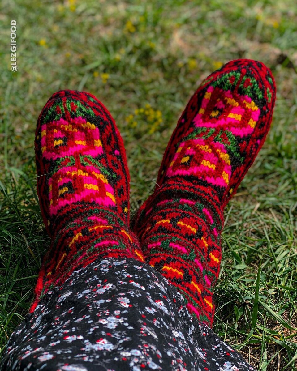 Узорное вязание. ⠀ Определенное место в домашнем производстве лезгин не только в XIX в., но и, вероятно, значительно ранее занимало узорное вязание шерстяных носков. ⠀ Это занятие было известно повсеместно и в горных, и в равнинных районах. Шерстяные носки вязали тремя железными спицами. Вывязывали сначала носок. При помощи двух спиц делали из нитки петлю, третьей спицей продевали сквозь нее другую петлю, т. е. вязали лицевой петлей. Этот процесс продолжался до тех пор, пока не заканчивался круг. Следующий круг вязался так же, как и первый и т. д. Затем вывязывали пятку. После того, как носки были готовы, их замачивали, надевали на колодку, имеющую вид подошвы. Это необходимо было для того, чтобы по мере высыхания носки растянулись и стали ровными. Все виды носков изготовлялись одним и тем же способом с той лишь разницей, что узорные носки вязались из ниток разных цветов. ⠀ Тот, кто живет на Кавказе, с легкостью различает даргинские и лезгинские шерстяные носки, изделия связанные в