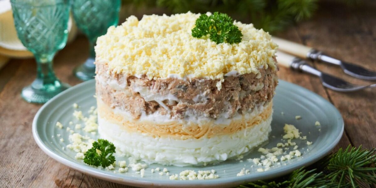 Ингредиенты • Вода - 150 мл • Соль - ½ ч. ложки +1 щепотка • Сахар - 1 ч. ложка • Винный или яблочный уксус - 1 ст. ложка • Лук - ½ штуки • Рыбные консервы - 200–250 г • Яйца - 3–4 штуки • Сыр - 100 г • Майонез - по вкусу Приготовление 1․ В горячей воде растворите ½ чайной ложки соли и сахар, перемешайте с уксусом. 2․ Лук нарежьте четвертинками колец. Залейте маринадом и оставьте на 10–15 минут. После слейте всю жидкость. 3․ Яйца отварите вкрутую. Остудите, очистите и отделите белки от желтков. 4․ Натрите белки и сыр на крупной тёрке, а желтки — на мелкой. 5․ Из банки с консервами слейте жидкость. Рыбу разомните вилкой. Используйте любую рыбу по своему вкусу. 6․ В салатник или на тарелку через кольцо выложите слой белков и слегка посолите. Смажьте майонезом или покройте сеточкой из него. 7․ На белки выложите сыр и снова добавьте майонез. Сверху распределите половину рыбы, маринованный лук и оставшуюся рыбу. 8․ Смажьте салат майонезом и посыпьте мелко натёртыми желтками.