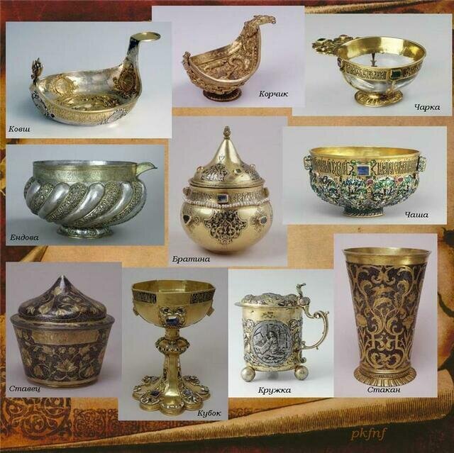 Самых разных ёмкостей для распития спиртных напитков наши предки придумали массу: рога, кубки, чаши, братины, ковши и множество других. Часто посуду для хмельных напитков делали из самых дорогих материалов, в том числе серебра и золота. Бытовые же предметы чаще всего изготавливали из дерева, глины или металла.