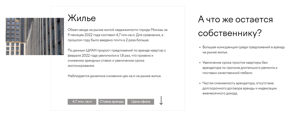Офисная недвижимость отличается выгодным сочетанием высокой доходности при низкой конкуренции из-за небольшой осведомленности частных инвесторов об инвестиционном потенциале сегмента. Высокий спрос на офисы объясняется активностью арендаторов и инвесторов, в том числе частных, которые раньше приобретали преимущественно квартиры. Однако доходность от сдачи в аренду офиса или торгового помещения выше. Сдача в долгосрочную аренду объектов жилой недвижимости приносит в лучшем случае 4–5% IRR. В последнее время эта доходность падает, так как стоимость 1 кв. м жилья растет, а арендные ставки на квартиры стагнируют.