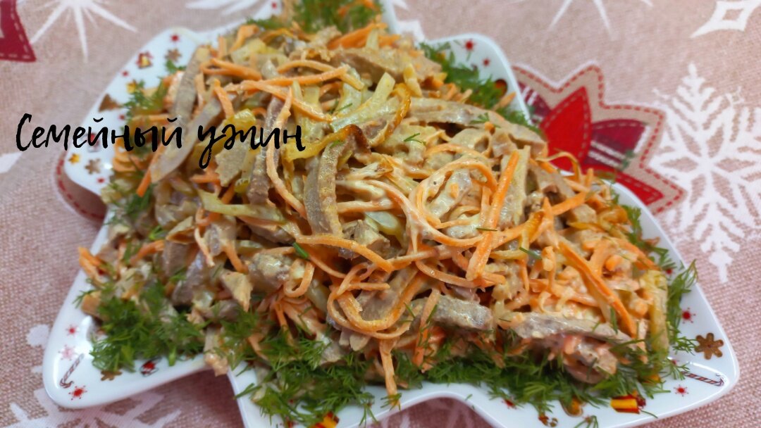 Ни один праздник, а тем более Новый Год не обходится без вкуснейших деликатесов! Поэтому, такой салат из говяжьего языка непременно должен быть на вашем праздничном столе! Язык нужно отварить в течении 2 часов. Затем залить холодной водой и оставить в ней до остывания. После этой процедуры язык легко очищается от верхнего грубого слоя. Язык нарезать тонкой соломкой. Лук нарезать полукольцами и обжарить до золотистого цвета на растительном масле. Добавить морковь по - корейски. Огурцы порезать тонкой соломкой. Чеснок пропустить через пресс. Салат заправить майонезом. По желанию украсить зеленью. Ингредиенты: Язык говяжий - 500 г Соленый огурец - 4 шт средние Морковь по-корейски - 200 г Лук репчатый - 3 шт Майонез - 2-3 ст.л. Приятного аппетита!