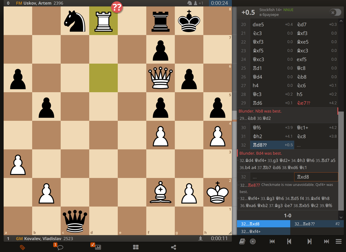 На 32-м ходу (партия) чёрные, когда у них оставалась одна секунда, сделали ход не по правилам. Ковалёв остановил часы, позвал судью. Партия возобновилась с критического момента, чёрные не сделали ход, их время вышло. Фигуры уже были расставлены на начальные позиции, как судья потребовал вновь продолжить партию. Усков снова сделал ход не по правилам ("Как мне за одну секунду [успеть взять ладью и переключить часы одной рукой]?"). Партия возобновилась в четвёртый раз, 12-летний Артём не сумел сделать всё одной рукой и убежал, не поздравив соперника с победой. В И Д Е О Ну, действия юноши чего комментировать. Примечательнее то, как неуклюже пытается сладить с ситуацией судья. Подобные "неловкости" всегда возникают в системе, где на оплачиваемые должности люди подбираются не по профессиональным критериям, а из соображений выгоды, либо - в лучшем случае - без соображений вообще. В ФИДЕ давно такая система. * * * Спасибо за уделённое время. Если вам была интересна публикация, не сочтите за