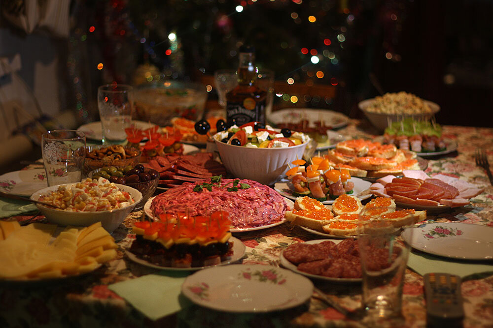 Самая главная вредная традиция всех новогодних столов – устраивать гастрономическое пиршество, с которым невозможно справиться. Как итог: каждого блюда будет съедено по ложке, а все остальное отправится стоять в холодильник на целую неделю.