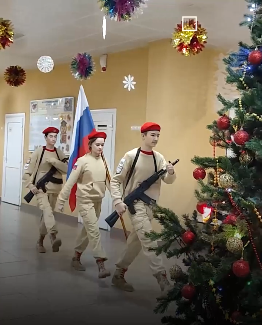 Немного сутулившись, молодые ребята в военной форме с автоматами вышагивали с флагом мимо наряженной елочки, снеговиков и деда Мороза. Данное действо обрамляло торжественное музыкальное сопровождение.