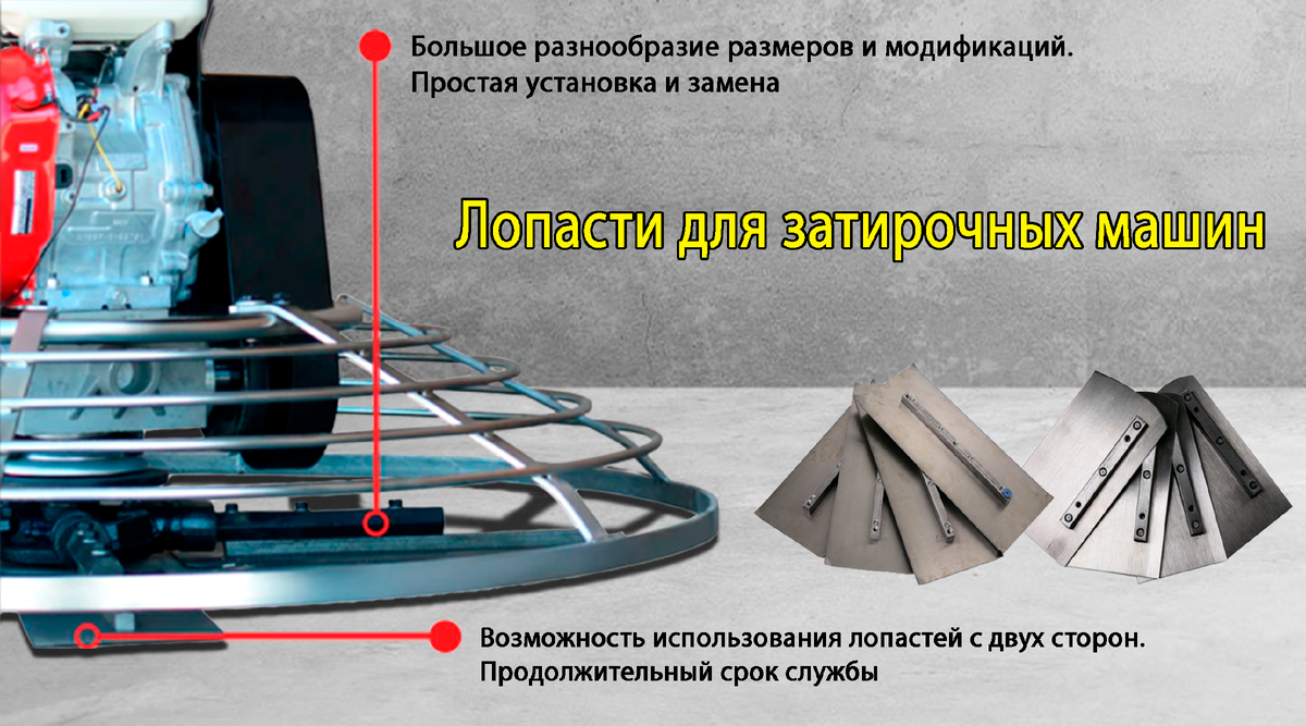 Изготавливаются из высокопрочной стали, служат долго. Предусмотрено двухстороннее использование с возможностью замены крепежа по мере истирания. Наши лопасти подходят не только к китайским затирочным машинам. Большое разнообразие размеров и модификаций позволяет устанавливать их на модели таких брендов, как ATLAS COPCO, ALLEN, ENAR, BTC, MASALTA, CONMEC, DYNAMIC, SHATAL, STONE, WACKER и многие другие. Мы реализуем расходники на рынке уже более 12 лет, за это время они зарекомендовали себя как качественный продукт с высокой производительностью, что подтверждает стабильный спрос на них среди наших партнёров. Наши контакты: Общий телефон: 8 (495) 647-00-26