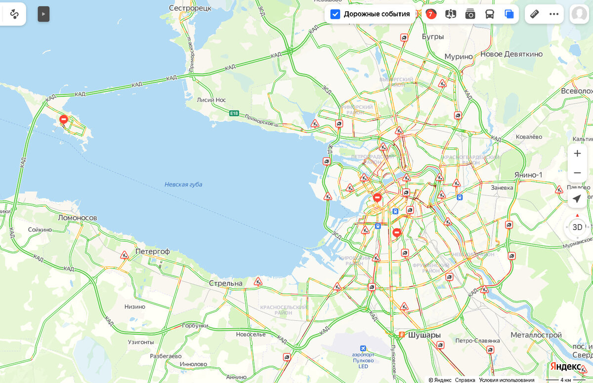 Неожиданно плотное — на максимальные 10 баллов вместо обычных пяти — движение, по данным «Яндекс.Пробок», наблюдается сейчас на проспекте Маршала Жукова. Всего на балл свободнее на Витебском проспекте. Уже плотно забиты Староневский, съезд с набережной Обводного канала к мосту Александра Невского, Лиговский и Литейный проспекты на подъездах к Невскому, Садовая улица. Пироговская и Выборгская набережные «побагровели» в сторону севера города.