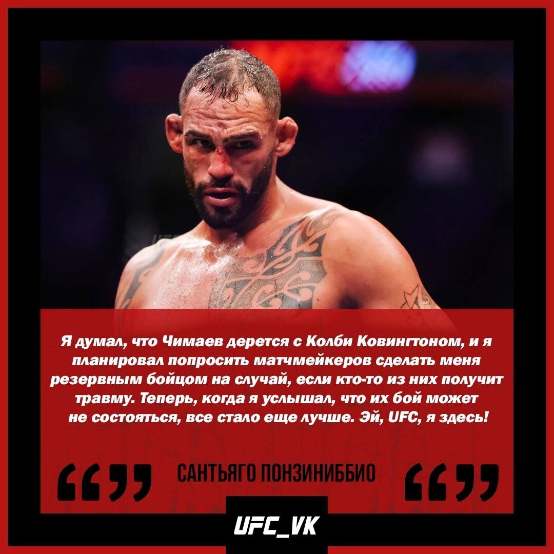 ⚡💭 Сантьяго Понзиниббио бросил вызов Чимаеву: «Эй, UFC, я здесь!» Аргентинский полусредневес UFC Сантьяго Понзиниббио сообщил о желании провести бой с Хамзатом Чимаевым. «Я думал, что Чимаев дерется с Колби Ковингтоном, и я планировал попросить матчмейкеров сделать меня резервным бойцом на случай, если кто-то из них получит травму. Теперь, когда я услышал, что их бой может не состояться, все стало еще лучше. Эй, UFC, я здесь!» – сказал Понзиниббио. В декабре Понзиниббио нокаутировал Алекса Мороно в третьем раунде.