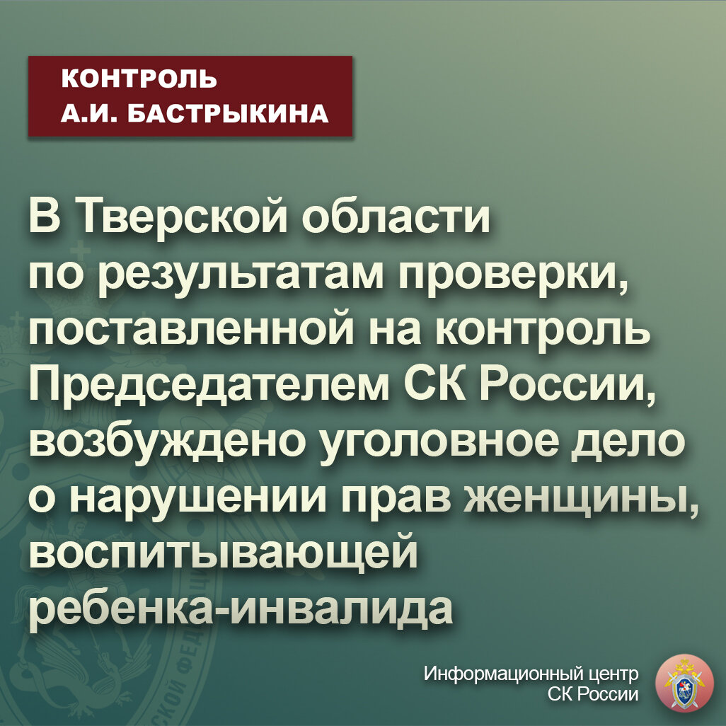 В Тверской области по результатам проверки, поставленной на контроль Председателем СК России, возбуждено уголовное дело о нарушении прав женщины, воспитывающей ребенка-инвалида