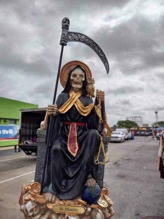 Связь между Санта-Муэрте и ангелом смерти осуществляется через фигуру Мрачного Жнеца. Мрачный Жнец - еще один титул, который часто дается ангелу смерти, хотя Мрачный Жнец в конечном итоге превратился в самостоятельную культурную фигуру, независимую от Азраила. Конечно, эти двое имеют одинаковые образы, оба часто изображаются в виде крылатых мужских скелетов, одетых в рваные черные одежды и несущих здоровенные косы и песочные часы. Даже будучи воплощениями универсального опыта — смерти — трудно представить, как ангел смерти и Мрачный Жнец стали такими распространенными и популярными культурными символами. Печаль, горе и боль, сопровождающие Смерть, редко делают ее желанным гостем. Как же тогда Мрачный Жнец получил такую культурную поддержку, чтобы стать независимой фигурой?