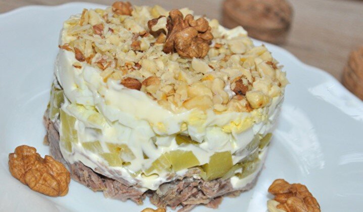 4.На дно в салатницу выкладываем слоем мясо отваренное, промазываем майонезом, на мясо кладем огурцы с чесноком, делаем сеточку из майонеза, на огурцы кладем яйцо, на терке протертое сверху, между слоями промазываем майонезом Орешками жареными сверху посыпаем на готовый салат. 5.Ставим салатик в холодильник. Даем ему настояться 6-8 часов можно на ночь.