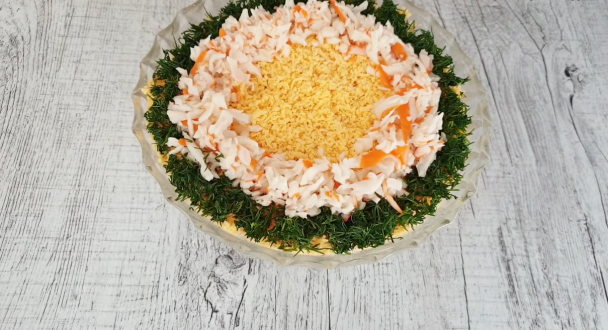 Что вам понадобится: 4 яиц; 200 г крабовых палочек; 100 г твердого сыра; 1 яблоко; лимонный сок; пучок укропа; 2 столовые ложки майонеза. Приготовление не требует много времени: Натереть сыр, крабовые палочки, яйца (белки и желтки отдельно), яблоко. Яблоко нужно обязательно полить лимонным соком, чтобы оно не потемнело. Салат выкладывается слоями: белок – сыр – крабовые палочки – яблоко – желтки. Каждый слой смазывается сеточкой из майонеза. Сверху посыпать измельченным укропом (края) и оставшимися крабовыми палочками.