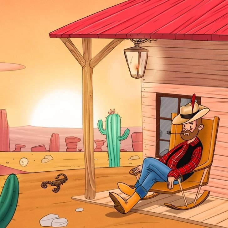 Сегодня в игре на внимательность, которую мы подготовили для вас, мужчина мирно отдыхает кресле-качалке на крыльце своего дома. Но он и понятия не имеет, что опасность затаилась возле него, и ждет подходящего момента. Нет, это не скорпион, который ходит неподалеку. Где-то на картинке спрятана ядовитая змея, которая может укусить мужчину. Так что теперь вы единственный человек, который может спасти его, на счету каждая секунда. Сможете ли вы найти и сказать, где змея, в течение 10 секунд? Интересный факт: