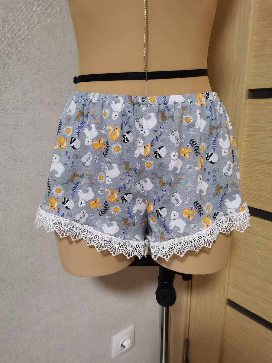 Наверное, полчаса - это я преувеличила 🙄 Крой - это отдельное мероприятие ☝🏻 Я всегда крою много вещей и складываю их до момента пошива. Таким образом, процесс шитья этих шортиков прошел максимально быстро. Выкройка бесплатная. Автор - Элтна Патыкова. Я просто увидела шорты на сайте в разделе бесплатных женских выкроек и подумала, почему бы и да? 😄 Материал - хлопковое трикотажное полотно (кулирка). Для 100% кулирки свободные модели - лучший вариант. Кулирка из запасов, но совершенно смешным метражом, около метра с хвостиком. Первым делом я кроила сорочку, а из остатков получились детали шортиков. Остаточки совсем маленькие, по классике, пойдут на нижнее белье 👌🏻 Шить, конечно, тут нечего. 3 шва на оверлоке можно сделать в два счета. Срезы на ножках и талии также обработала оверлоком. Шортики довольно короткие, поэтому забирать длину подгибкой я не намеревалась, почти сразу определилась, что буду использовать кружево. Вообще любую одежду можно разнообразить кружевом, 100% вариант