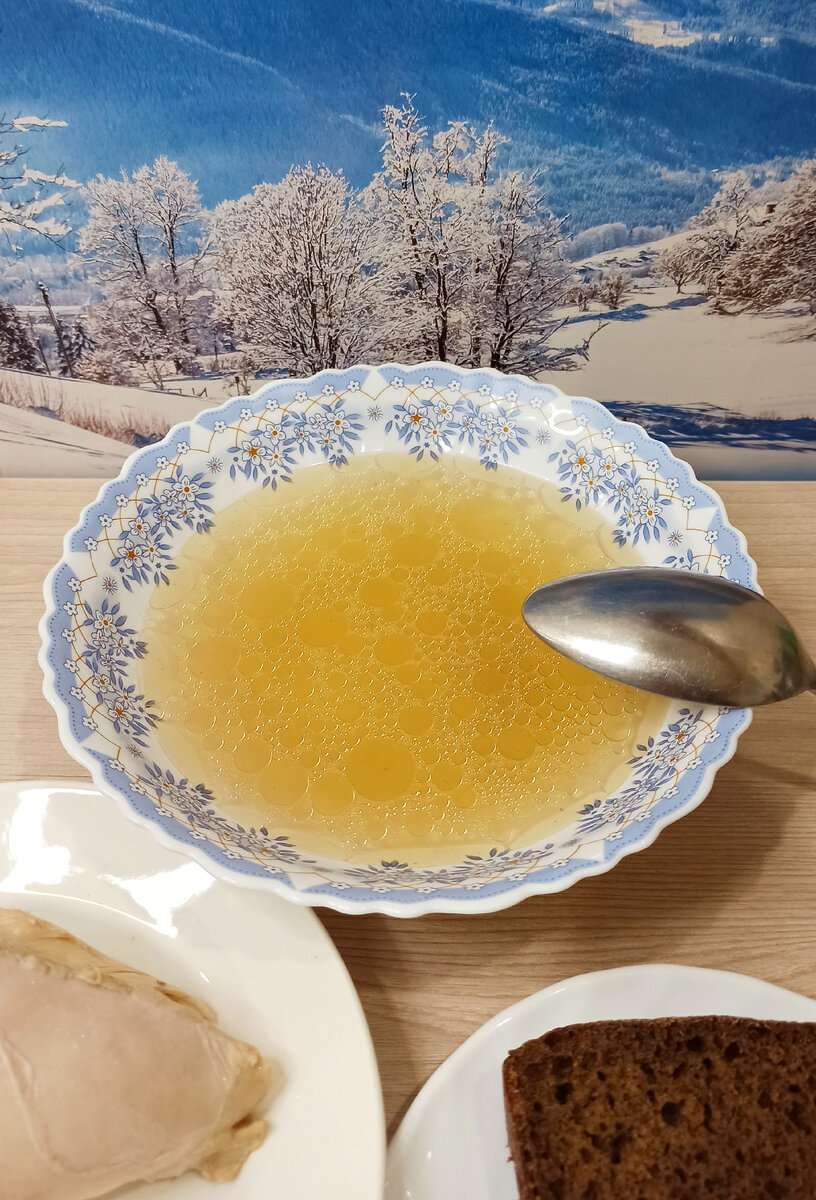 Куриный бульон, прозрачный, красивый, наваристый и очень вкусный.