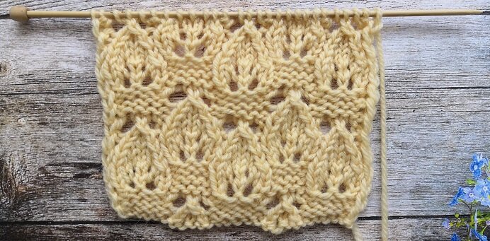 Ажурный узор спицами "МЕЛКИЕ ЛИСТИКИ" описание и схема Набрать количество петель кратно 10 (раппорт узора)+5п для симметрии +2 кромочные петли. На схеме показаны только лицевые ряда. Изнаночные ряды будем провязывать по риснку полотна. Накиды провязывать изнаночными петлями. Каждый новый ряд необходимо начинать и заканчивать кромочными петлими, между которых будет повторяться раппорт узора, после раппорта провязать петли по схеме. Вязать рисунок до конца полотна чередуя с 1-го по 14-й ряды. 1-й ряд (лиц. сторона): 1 кром.петля, *5 изн, 2 петли провязать вместе с наклоном влево, 1 лиц., 2 петли провязать вместе лицевой*, повторять от * до посл. 6 петель, 5 изн.,1 кром.петля. 3-й ряд (лиц. сторона): 1 кром.петля, *5 изн, накид, 3 петли провязать вместе с наклоном влево, накид*, повторять от * до посл. 6 петель, 5 изн.,1 кром.петля. 5-й ряд (лиц. сторона): 1 кром.петля, *1 изн, 1 лиц., накид, 1 лиц., накид, 1 лиц., 4 изн.* до посл. 6 петель, 1 изн.,1 лиц., накид, 1 лиц., накид, 1 лиц.,1