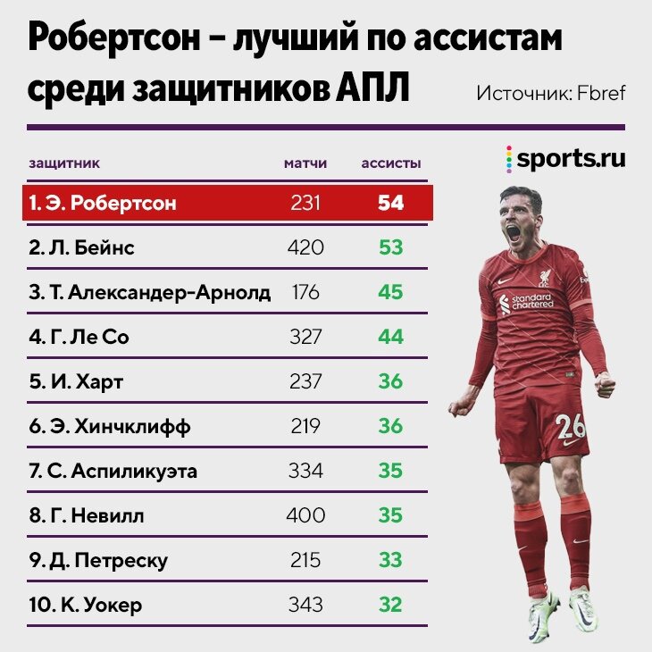 Обогнал Бейнса из «Эвертона». В первом матче после возвращения АПЛ «Ливерпуль» обыграл «Астон Виллу» 3:1. Салах открыл счет уже на пятой минуте – закатил в пустые с передачи Эндрю Робертсона. Для шотландца этот ассист стал 54-м в Премьер-лиге. И да, это рекорд среди защитников. Предыдущее достижение принадлежало легенде «Эвертона» Лейтону Бейнсу: 53 голевых передачи (без учета пасов на автоголы и заработанных пенальти). • Наверное, надо сделать небольшую оговорку: считались только ассисты игроков, которые всю карьеру провели на позиции защитника. Потому что на сайте Премьер-лиги среди защитников лидирует Эшли Янг (71 передача), который большую часть карьеры провел в атаке, а в пятерку забрался Антонио Валенсия (46 передач), тоже поигравший в атаке. • Из действующих игроков Робертсона в теории могут догнать Аспиликуэта, Уокер, Крессуэлл из «Вест Хэма» (29 ассистов), Люка Динь и Киран Триппьер (по 22). Но главный преследователь – конечно, Трент. В этом сезоне одноклубник Робертсона пока
