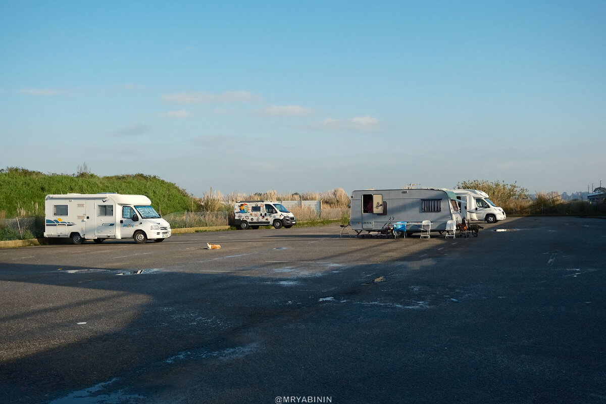 Говорить о Европе только в положительных тонах можно, если ездишь только туристом-овощем по проторенным дорожкам, а если иногда заходишь "за флажки", то можно увидеть обратную сторону. Ради этого я даже отойду от хронологии событий и забегу вперед. Вчера были в известном и популярном у туристов и у местных городке Авейро (Португальской Венеции). В городе на микроавтобусе припарковаться нереально, городская парковка тоже теснована, а учитывая, что были планы тут переночевать, встал на специальной парковке, выделенной специально для автодомов. И тут началось. Нашей соседкой стала импозантная дама на трейлере с французскими номерами, явно живущая здесь очень давно, прямо посреди парковки. Дама в розовом смотрелась очень эффектно, порхая между луж и кемперов. Вероятно под мостом стоит и "тягач", на котором жильцы трейлера ездят в город, но трейлер выглядит во так. Сам паркинг выглядит довольно "эффектно". Располагается на самой окраине города, в пяти минутах от центра, рядом с большой обще
