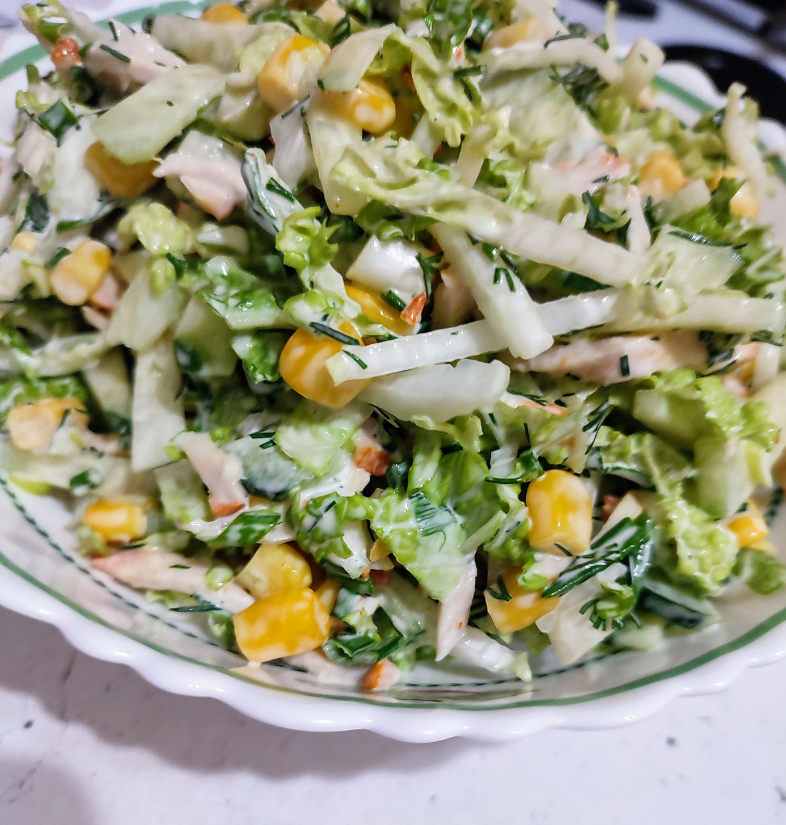 Очень люблю этот салат 🥗❤️❤️ Впервые его попробовала в гостях , очень понравился 👌👍 Теперь всегда его готовлю как в будни , так и на праздники подходит . Вообще я люблю блюда , которые быстро и легко готовятся, из доступных продуктов .И этот салат , как раз тому подтверждение . Готовка занимает примерно 10 минут . Ингридиенты : - Пекинская капуста- одна небольшая - Копчённая грудинка или окорочок!-100 гм -Консервированная кукуруза - Зелёный лук - пол пучка - Свежий огурец -2 шт - укроп - пол пучка Нарезаем наш главный ингридиент 😄, курицу , длинной соломкой !Можно конечно другие варианты нарезки , мне этот нравится больше .👌 Далее такой же соломкой нарезаем свежий огурец , не советую нарезать его слишком тонко , иначе быстро размякнет, достаточно как на фото. Далее : Такой же соломкой нарезаем пекинскую капусту, она тоже очень мягкая , поэтому слишком тонко нарезать не стоит 👌 Затем Длинными кольцами режем зелёный лук так красивее 😄 Добавляем мелко нарезанный укроп