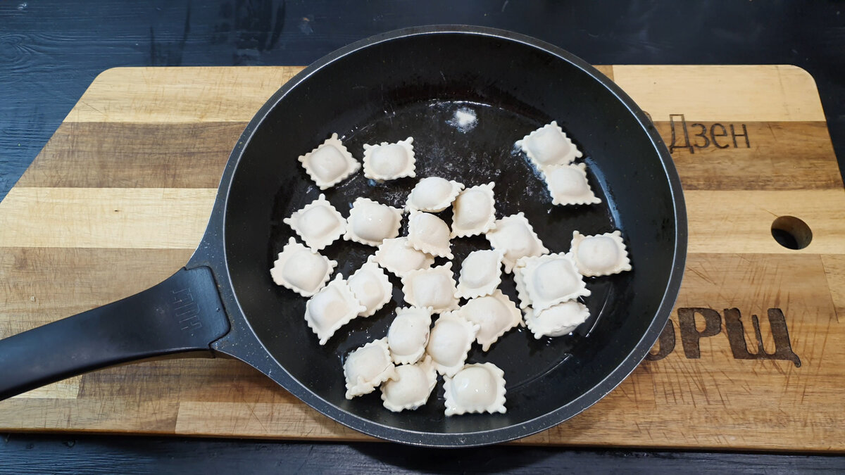 Пачку любимых пельменей отправляем на разогретую сковороду.