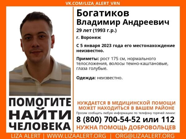 Житель Центрального района Воронежа исчез 5 января 2023 года. Уже больше недели он не выходит с родственниками на связь. Об этом сообщили в поисково-спасательном отряде «Лиза Алерт». Волонтеры просят воронежцев помочь с поисками. Возможно, вы видели 29-летнего Владимира Б. Его рост 175 сантиметров, среднее телосложение, темно-каштановые волосы и голубые глаза. К сожалению, во что он был одет в день исчезновения неизвестно. Кроме того, парень нуждается в медицинской помощи. Если вы обладаете какой-либо информацией о пропавшем, просьба позвонить по номеру телефона горячей линии отряда 88007005452 (бесплатно по РФ) или 112. Напомним, что в Воронежской области также разыскивают пропавшую без вести 16-летнюю девушку. Елена Ж. может находиться в нашем регионе. Поиски изначально открыли в Рязанской и Московской областях. С 9 декабря местонахождение девушки неизвестно.