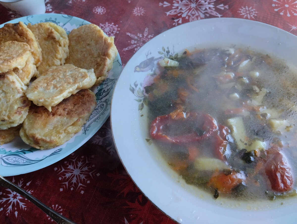 Привет, друзья! В такие морозы, как сейчас стоят, не плохо пообедать горяченьким. Я уже пару дней не хожу в магазин- у меня полная морозилка всякой всячины. Есть и мясо и рыба. Полно разных овощей и ягод с дачи. Не обошлось в морозилке без стекольных листьев и многими так не любимой и критикуемой сныти. Вчера решила сварить овощной суп с курицей. Сначала приготовила бульон из хребта и киля курицы. Первые 2 воды слила. Потом добавила в бульон тертую твкву, репчатый лук, 1 дольку чеснока. Покрошила 1 картошину кубиком. Немного посолила. Добавила перец горошком, лавровый лист, и сушёный дачный укроп. В ход пошли вяленые помидоры и сныть со свекольными листьями из морозилки. Также добавила несколько мелких замороженных помидор "пуля". Достала курицу, почистила от косточек, разложила по тарелкам. Ну красота же! И почти всё овощи свои, из морозилки. Наваристо получилось и вкусно. Прямо летом пахнет с такую стужу! Сегодня наподобие суп сварю с фасолью. Фасоль в моих закромах также им