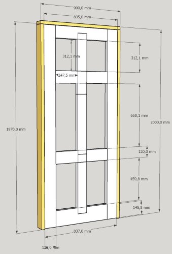 Я никогда не делал дверей. Я даже не устанавливал готовые двери. Все что было у нас общего с дверями - это ключи, причем подходили они далеко не ко всем. А теперь я поставил перед собой задачу сделать 10 дверей: для бани, дачного домика, туалетика и конечно же мастерской. Безусловно все строения имеют входные металлические двери, но пришло время задуматься о благоустройстве. Начать я решил с мастерской, где и провожу большую часть времени. Разделена она на две неравные части, одну использую большим образом как склад и место для струшкоотсоса, в другой работаю. На улице зима и приходится топить мастерскую, а значит электричества расходуется не мало. Поэтому первым делом изолирую два помещения межкомнатной дверью, которую сделаю сам и в первый раз в жизни. Как обычно, первым делом во всем известной программке делаю эскиз - чертеж, прикидываю соотношение всех деталей, высчитываю необходимое объём и количество материала, не забываю про фурнитуру. Далее, как уже обычно, из необрезной доски