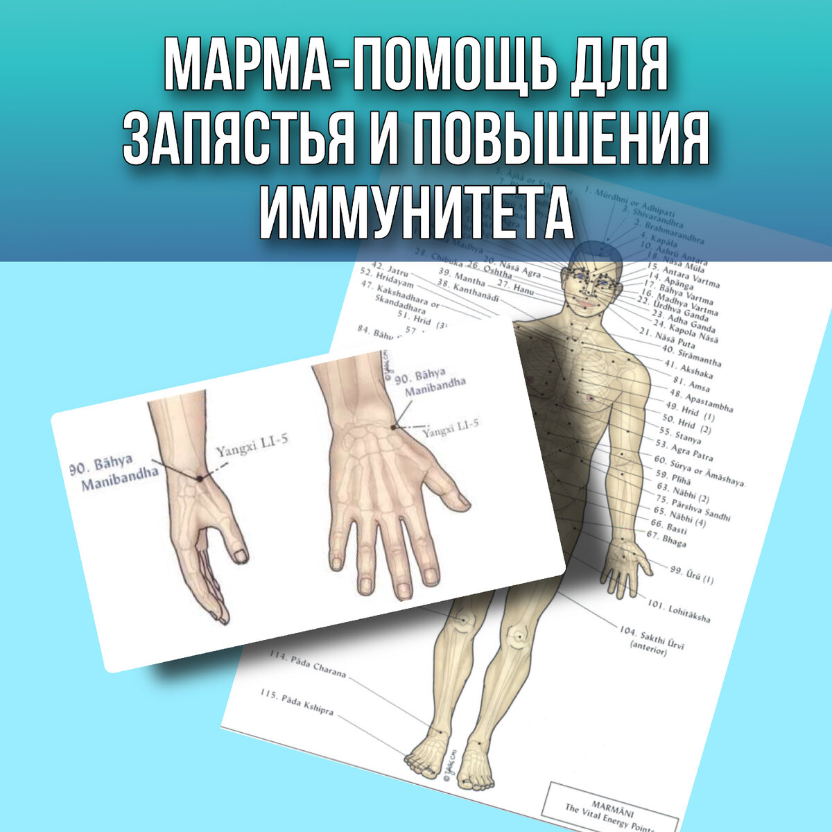 Напоминаю, что мармы - это особые энергетические точки, находящиеся на пересечениях тонких каналов (Нади), а физически они располагаются на плотных тканях организма (связках, мышцах, суставах, костях, коже). На протяжении веков техники марма-терапии были засекречены, они были великим тайным знанием, доступным лишь избранным. В статье «Древний тайный способ исцеления сегодня доступен каждому!» я рассказываю об этом чудесном методе. Возможно вам будет интересно, прочтите. С помощью воздействия на эти точки, мы можем помочь своему организму преодолеть тот или иной недуг. Но прежде чем начинать практиковать марма-терапию, ознакомьтесь со статьей "Какие заболевания лечит марма-терапия. Какие есть противопоказания и как правильно воздействовать на энергетические точки" Сегодня разберем точку Бахья Манибандха. Эффекты: 💥улучшает функционирование запястья и кисти 💥повышает иммунитет и сопротивляемость организма 💥 лечит артрит 💥точка на правой руке очищает печень, улучшает функцию желчного