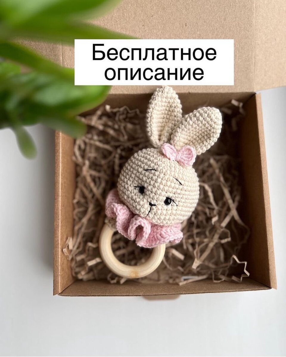 🐰 Автор описания: @malina.toy Материалы: -Пряжа yarnar jeans -Крючок 2 -Глазки на безопасном креплении 6мм -Кольцо диаметр 55 или 60мм. -Гремелка Голова: 1. 6сбн в ка (6) 2. 6 пр. (12) 3. (1сбн, пр)*6 (18) 4. (2сбн, пр)*6 (24) 5. (3сбн, пр)*6 (30) 6. (4сбн, пр)*6 (36) 7. (5сбн, пр)*6 (42) 8. (6сбн, пр)*6 (48) 9. - 18 . 48сбн (10 рядов 19. (6сбн, уб)*6 (42) 20. (5сбн, уб)*6 (36) 21. (4сбн, уб)*6 (30) 22. (3сбн, уб)*6 (24) 23. (2сбн, уб)*6 (18) Сделать сс, нить спрятать Глазки вставить между 14 и 15 рядами, расстояние 8 сбн. Гремелку расположить в середине головы. Ушки: 1. 6сбн в ка (6) 2. (1сбн, пр)*3 (9) 3. (2сбн, пр)*3 (12) 4. (3сбн, пр)*3 (15) 5. (4сбн, пр)*3 (18) 6. 18 сбн (18) 7. (5сбн, пр)*3 (21) 8-12. 21сбн (5 рядов) 13. (5сбн, уб)*3 (18) 14. (4сбн, уб)*3 (15) Добавить шуршалку. Ушко сложить пополам и провязать 7 сбн, сделать сс, оставить нить для пришивания Воротник: 1. Набрать 22 вп 2. Со 2 петли от крючка провязать 3ссн в каждый