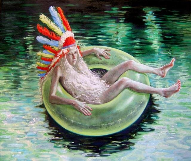 Её работы 2000-х годов заинтересовали меня соединением достаточно реалистичной изобразительной манеры и необычности сюжетов. Сам по себе необычный сюжет в наши дни – не новость. Особенно усердно отучали зрителей удивляться в ХХ веке мастера таких направлений, как дадаизм, сюрреализм и магический реализм (о представителях последнего направления можно прочитать здесь).