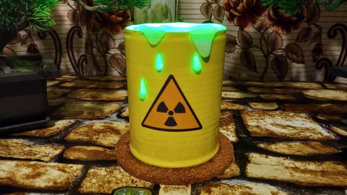 Клеевым пистолетом наносим на разрезы клей. Это будут капли вытекающего из дырявой бочки «радиоактивного химиката».