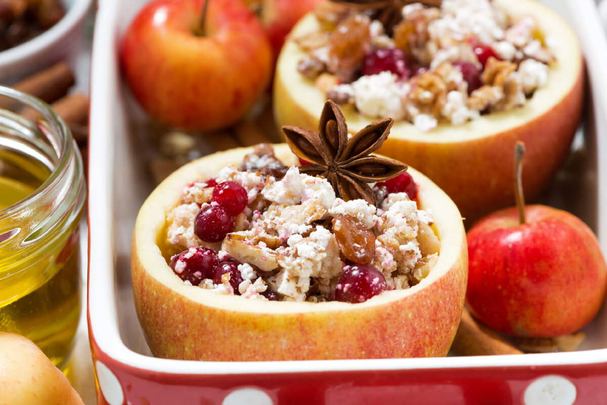 Употребление в пищу способствует образованию гемоглобина, нормализует работу нервной системы, защищает от атеросклероза, укрепляет костную ткань. Яблоки с творогом, медом и корицей Для пр