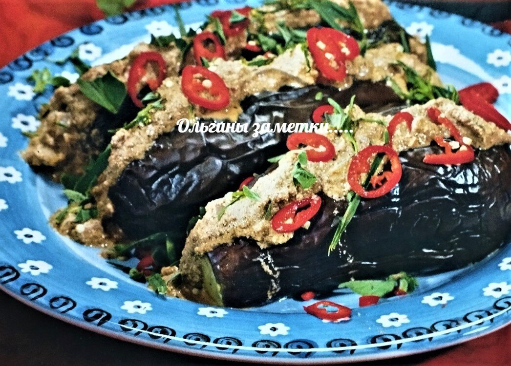 Приветствую всех ! Сегодня я представляю вам интересное блюдо из баклажана - сациви ! Это один из красивых и , главное , очень оригинальных рецептов ! Я нашла его в старом журнале и решила приготовить. Оказалось очень вкусно и теперь это одно из любимых праздничных блюд на нашем столе. Итак , приступим ! Ингредиенты; 500 г баклажанов 2 луковицы 4 зубчика чеснока 0,7 стакана очищенных грецких орехов 100 мл сухого белого вина 1 ст. л. растительного масла 1 ч. л. молотого кориандра 0,5 ч. л. хмели - сунели 3 бутона гвоздики 1 стручок горького перца * щепотка корицы * соль * молотый черный перец Пошаговое приготовление; 1 Баклажаны вымыть, удалить плодоножки. Сделать сбоку у каждого глубокий прорез. 2 Положить баклажаны в кастрюлю, залить горячей водой, закрыть крышкой, довести до кипения и варить на маленьком огне 20-30 минут. Снять с огня, откинуть на дуршлаг, дать немного