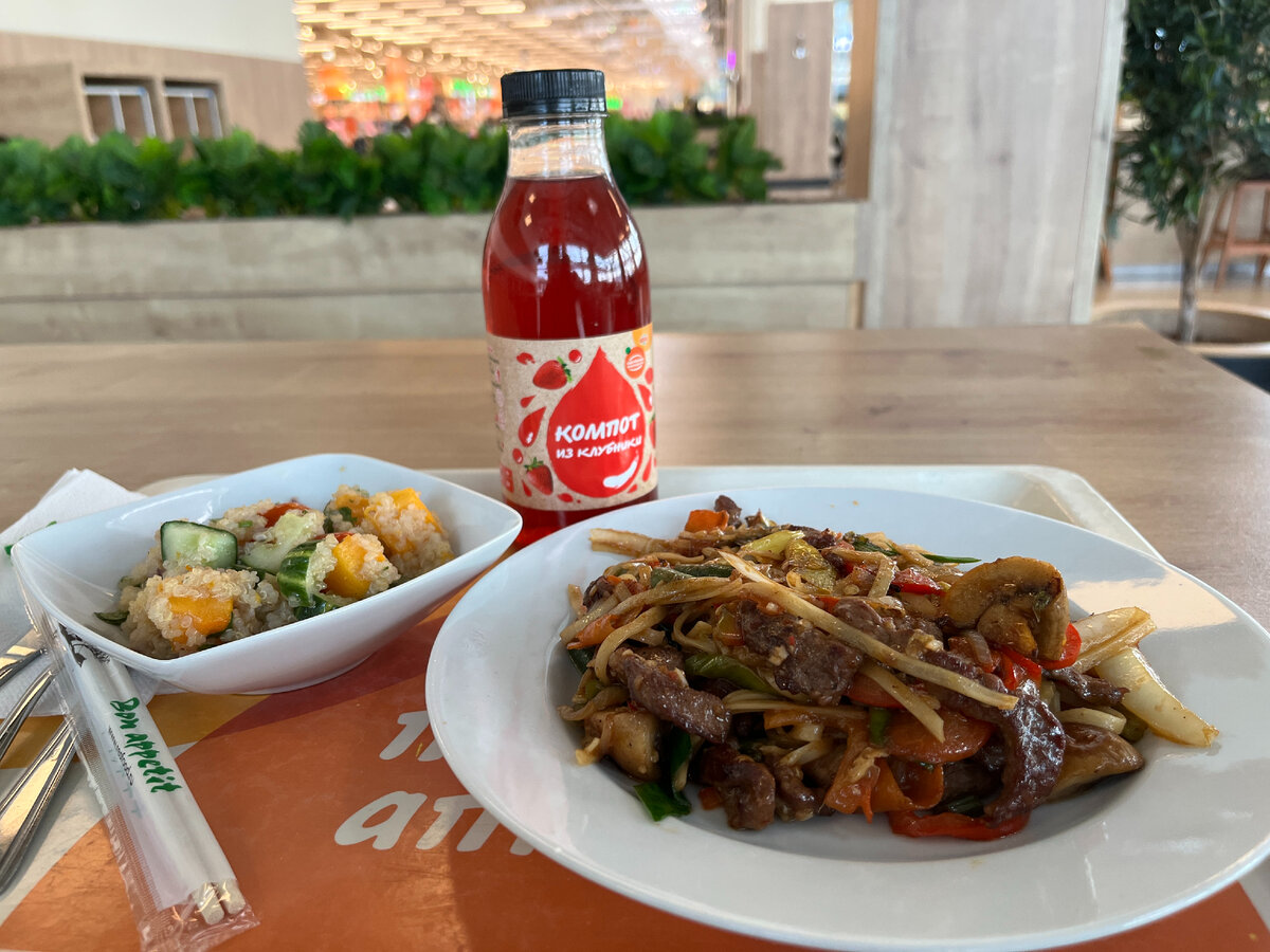 Можно вечно смотреть на огонь, морские волны и на вок, в котором для тебя готовят вкусную еду. Решил позавтракать в «Глобусе» и мой взгляд приковал отдел «Азия» кафетерия. Там готовят азиатчину прямо на месте, на глазах у изумлённого покупателя. Мне нравится кафетерий супермаркета «Глобус». Там вкусно, интересно и недорого. Выбор огромный, поначалу даже теряешься. Настоятельно рекомендую их лазанью, по-моему, она безупречна. Супчики очень вкусные – борщ с пампушками просто прекрасен. Летом – окрошка или, что ещё лучше, холодный свекольник. Есть грузинские блюда, итальянские, котлетки и фрикадельки с пюрешкой или чем-нибудь более замороченным... Короче, есть что поесть. В этот раз я взял азиатский вок, «здоровый» салатик и компот местного производства. Вот такой завтрак. Ход своей мысли при выборе блюд из этого набора объясню легко. Шёл с подносом мимо витрины «Здоровое питание», увидел салат с киноа за 100 рублей. Думаю, это интересно, надо брать. В салате – огурец, помидор, красный л