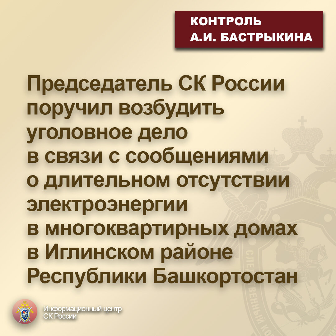 Председатель СК России поручил возбудить уголовное дело в связи с сообщениями о длительном отсутствии электроэнергии в многоквартирных домах в Иглинском районе Республики Башкортостан