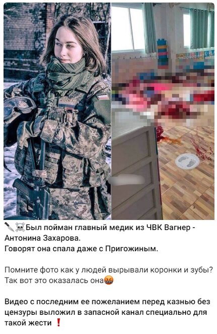 Правда, что украинские солдаты поймали главного врача ЧВК «Вагнер»? В украинских соцсетях и мессенджерах сообщают, что ВСУ поймали главного врача ЧВК «Вагнер» Антонину Захарову. В качестве доказательства в сеть выложили коллаж из двух фото. На одной — стоит девушка с оружием, на другой — размытое фото со следами крови. В сети есть несколько версий этой истории: на каждом снимке — другая девушка. Эта новость — фейк. Все фотографии, используемые украинскими каналами как доказательство, не имеют отношения к описываемой истории. Эти снимки можно легко найти в интернете. Например, фото девушки с пистолетом опубликовали в 2017 году на сайте Минобороны России. А размытое фото со следами крови — это снимки с места массового расстрела в Таиланде. В октября 2022 года уволенный полицейский застрелил 24 ребенка и 12 взрослых в детском саду в провинции Нонг Буа Лампху.