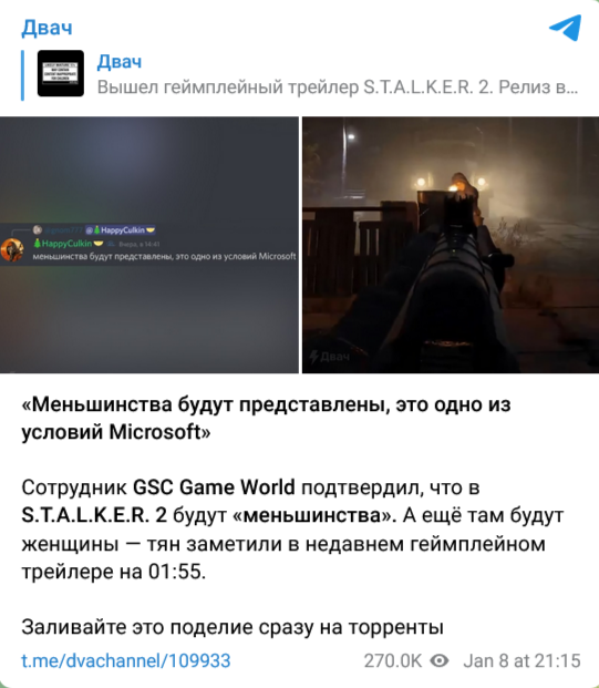 Что проверяем Правда, что в игре S.T.A.L.K.E.R. 2 появятся сексуальные меньшинства? С чего все началось Наличие сексуальных меньшинств стало одним из условий Microsoft для игры S.T.A.L.K.E.R. 2 — такая новость появилась в сети. Якобы это сообщил сотрудник GSC Game World в Discord. Как на самом деле После появления данного сообщения в Discord-канале фанаты начали писать разработчикам, на что получили ответ, что распространяемый в сети скриншот является фейком. Внимательные пользователи также заметили, что в Discord-канале никогда не публиковалось подобное заявление. Источник опровержения VGTimes: Заявление, что в S.T.A.L.K.E.R. 2 появятся секс-меньшинства, оказалось фейком