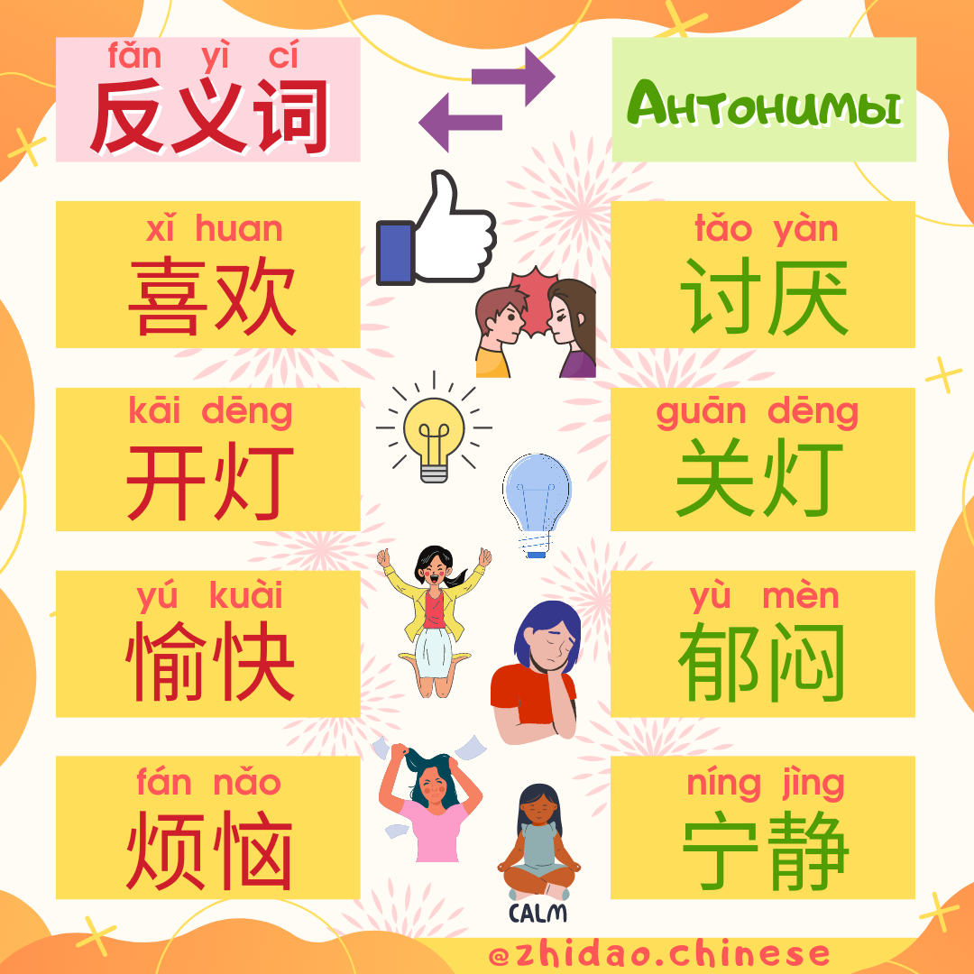 #zhidao_антонимы Сегодня вас ждет новая подборка антонимов - слов с противоположными значениями! Такие слова по-китайски называются (反义词 fǎnyìcí) ↔️ 🔊 Открывайте видео и включайте звук, чтобы услышать, как произносится каждое слово! 😋 喜欢 xǐhuan нравиться, любить 😖 讨厌 tǎoyàn испытывать отвращение (к кому-либо, чему-либо), антипатию 💡 开灯 kāidēng включить свет, зажечь лампу 🌑 关灯 guāndēng выключать свет, гасить свет ☺️ 愉快 yúkuài приятный, весёлый, радостный 😥 郁闷 yùmèn тосковать, грустить, печальный 😠 烦恼 fánnǎo раздраженный, беспокойный, удручённый 🧘 宁静 níngjìng спокойный, уравновешенный 📝 Ссылка на карточки Quizlet для изучения новых слов: https://quizlet.com/_clgss3?x=1qqt&i=2r5snr 📚 Хотите, чтобы Вы или Ваш ребенок заговорили на китайском? Напишите нам для записи на групповые / индивидуальные занятия! 🎓 #china #chinese #школакитайского #китайский #москва #язык #китайскиймосква #учукитайский