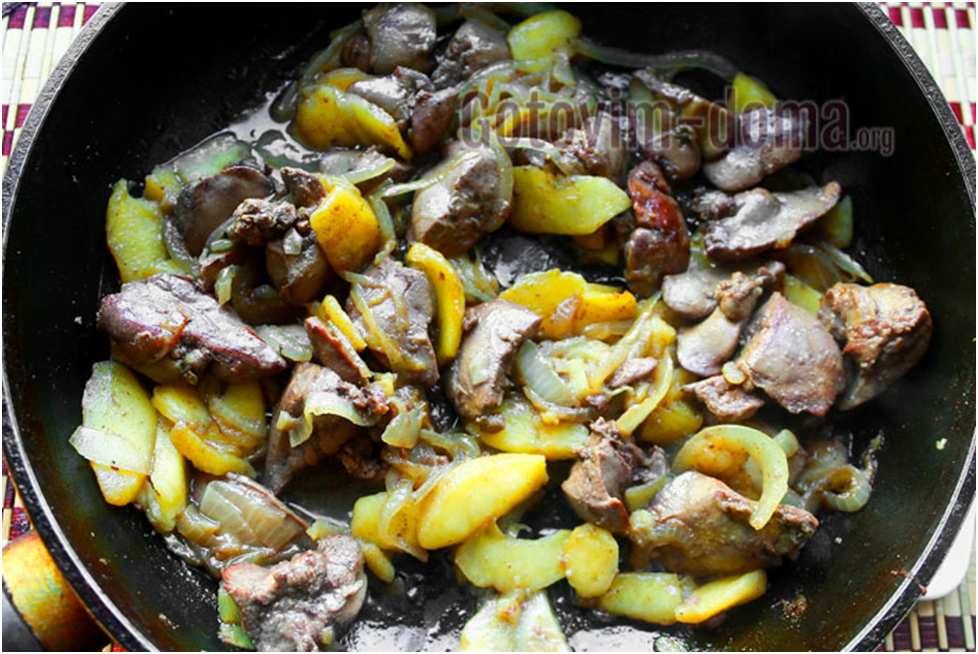 печень куриная - 500 гр. лук - 1 шт. яблоки кислые или кисло-сладкие - 1 большое или 2 средних мука - 1 ст. ложка без горки соль по вкусу вода горячая - примерно, 150-200 гр. подсолнечное масло - 1-2 ст. ложки Приготовление: Печень промыть, нарезать средними кусочками . Лук нарезать полукольцами или кубиками на ваш вкус. Яблоки нарезать кубиками, кожуру не снимаю. На сковородку налить подсолнечное масло и обжарить лук, примерно 1 минуту. Далее добавить печень и перемешать. Всё готовить на умеренном огне . Добавить яблоки, перемешать, готовить 1-2 минуты, добавить муку, перемешать, посолить, влить немного воды. Печень не должна плавать в воде. Всё перемешать, закрыть крышкой, готовить ещё 5-7 минут на умеренном огне.