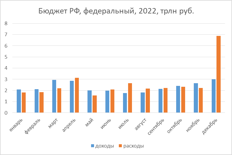 Вышли данные по федеральному бюджету за декабрь. В целом картина по доходам и расходам такая. Как видно, в декабре был большой скачок по расходам, в прошлом году - тоже был большой, но не настолько. Если посмотреть на рост в % по месяцам, то получим следующую картину. Доходы в декабре выросли на 5%, т.е. меньше инфляции (реально - упали). А вот расходы выросли почти в 1,5 раза. Суммарно с начала года картина такая. Рост доходов на 10%, что чуть ниже инфляции (она около 12%). По расходам же номинально рост почти на четверть (реально, получается, процентов на 12-13). Посмотрим в конце на динамику федерального бюджета в разрезе 30 предыдущих лет с учётом инфляции. Бюджет ушёл в минус, но не беспрецедентный, чуть лучше, чем в 2009-10, 2016 и 2020-м. И 1994-м, если уж вспоминать историю. Причина этому - не столько падение доходов (достаточно небольшое, из-за роста нефтяных доходов по причине высоких цен на энергоресурсы в 2022-м), сколько рост расходов, с 2020-го весьма заметный на фоне зас