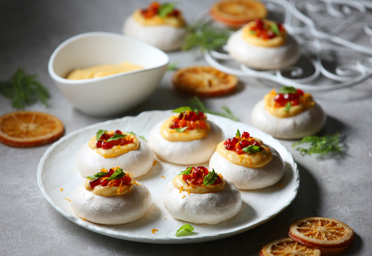 Новый год мы уже отпраздновали, но так не хочется отпускать это волшебное новогоднее настроение, которое дарит нам столько позитивных эмоций, собирая нас вместе за одним столом. Ну, а раз так, то никто не мешает нам продлить этот праздник и продолжить баловать себя самыми вкусными блюдами. Нежное как снег пирожное Павлова, украшенное ягодами или фруктами, станет идеальным продолжением праздничного изобилия. Настасья @podsousom предлагает приготовить мини-версию этого десерта, ведь тогда вы сможете угодить персонально каждому члену семьи. Узнайте заранее их предпочтения и приготовьте каждому маленький сюрприз. Клубника, малина, черника, киви, бананы, персики, маракуйя или цукаты, в этом изысканном десерте уместно всё. Сегодня мы отойдем от классических взбитых сливок и подадим Павлову с заварным апельсиновым кремом, а в качестве украшения выбираем гранат и рябину в сиропе. Поиграйте с подачей на контрасте текстур, подчеркнув нежность и воздушность пирожных стильной белоснежной посудой с