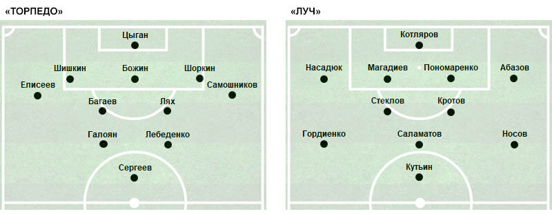 «Луч» (футболки - жёлто-синие): Котляров - к, Насадюк, Магадиев, Кротов, Абазов (Марущак, 36), Стеклов, Саламатов (Макаренко, 85), Пономаренко, Носов, Кутьин (Алиев, 61), Гордиенко (Квеквескири, 68).