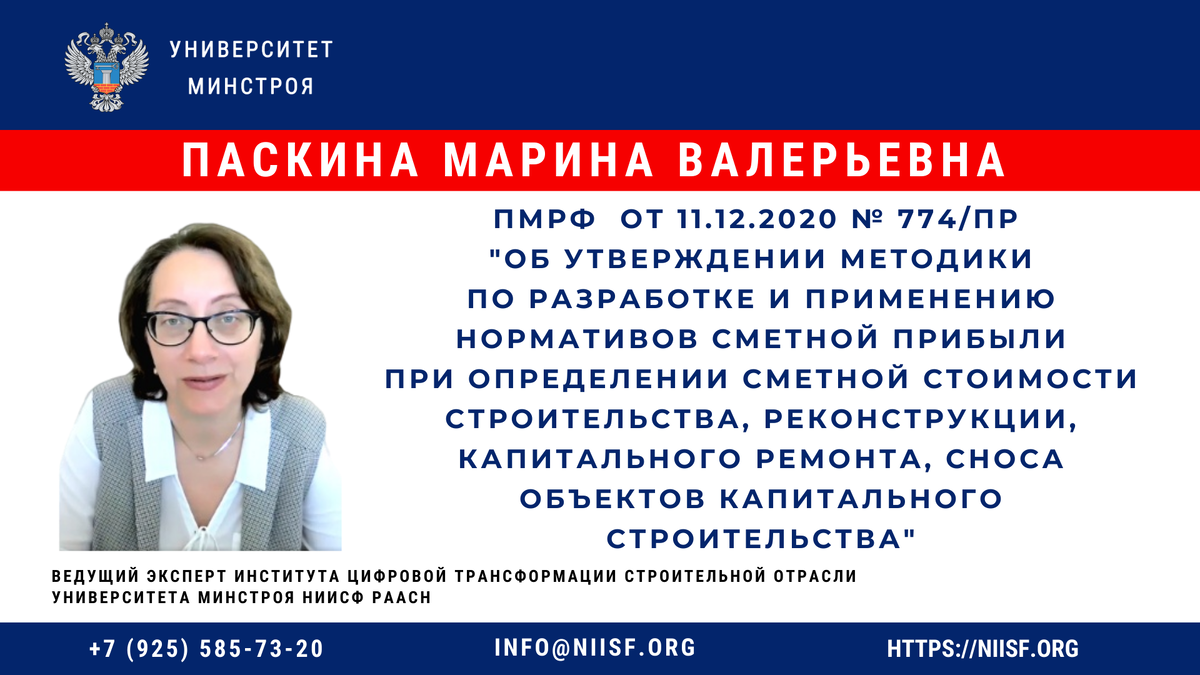 Вебинар: ПМРФ от 11.12.2020 № 774/пр "Об утверждении Методики по разработке и применению нормативов сметной прибыли при определении сметной стоимости строительства, реконструкции, капитального ремонта, сноса объектов капитального строительства" Спикер: Паскина Марина Валерьевна - Ведущий эксперт Института цифровой трансформации строительной отрасли Университета Минстроя НИИСФ РААСН Видео