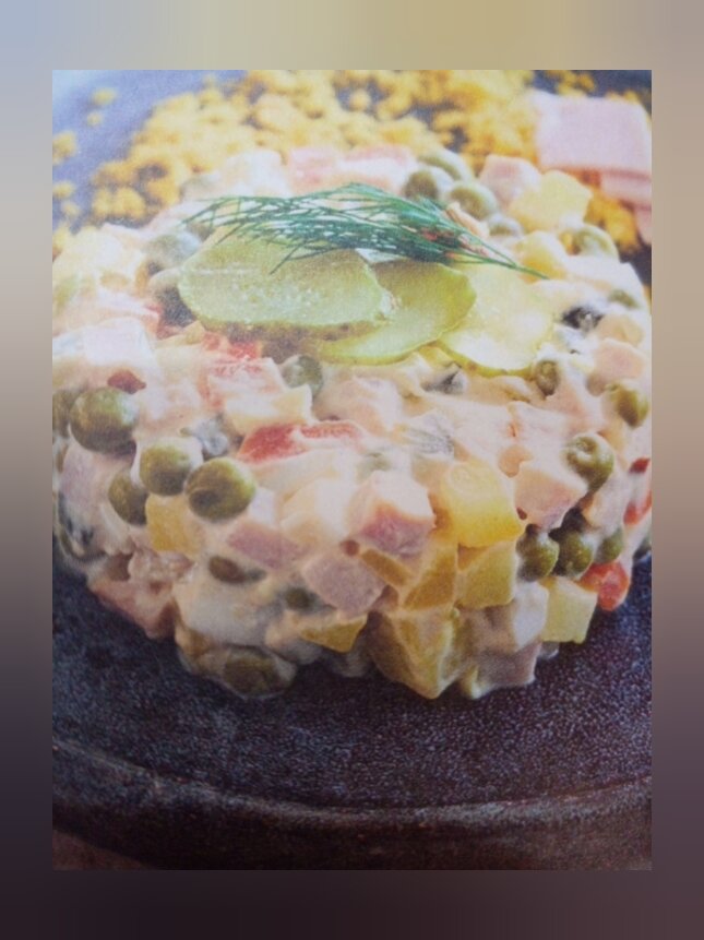 Я приветствую моих читателей на канале😀 Сегодня на обзоре "своеобразный рецепт салата",который разнообразит Ваш приевшийся "ВКУС"😊 ВРЕМЯ приготовоения 2ч+сутки на маринования мяса 4-6порций СОСТАВ САЛАТА: Для маринада окорока: Выложите на блюдо,украсив укропом,ломтиками огурца и окороком На 100г. готового продукта 140ккал. Есть такое,негласное поверие:яиц и картофелин в оливье должно быть такое кол-во,сколько народу собралось за столом-так ни кто ни останется голодным😀😍