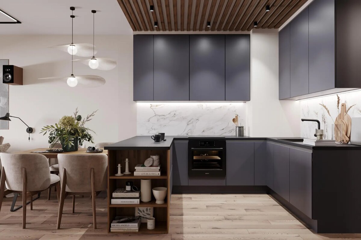 Цвет для кухни имеет большое значение, ведь он создает атмосферу и обеспечивает психологический комфорт. Интерьерная мода в 2022 и 2023 году делает акцент на приятных глазу и нейтральных оттенках бежевого и серого. 1. Оттенки грозового неба Холодные оттенки темно-серого также в списке трендов 2022-2023. Такие глубокие, но не кричащие цвета делают интерьер статусным и харизматичным. Как правило, в насыщенных тонах подбирают фасады для кухонного гарнитура, что позволяет визуально отделить зону готовки. А вот для отделки стен, оформления столовой и диванной зоны предпочтительны нейтральные светлые оттенки: кремовые, бежевые, песочные. Они органично дополняют сложный серый, создавая кухонному гарнитуру подходящий антураж. 2. Графичная монохроматика Богатая палитра оттенков серого — универсальное решение для любого интерьера: от классики до лофта и хай-тека. Сейчас наиболее востребованы нейтральные серые тона, способные добавить уюта и визуально объединить гостиную и кухню. Смело сочетаем в